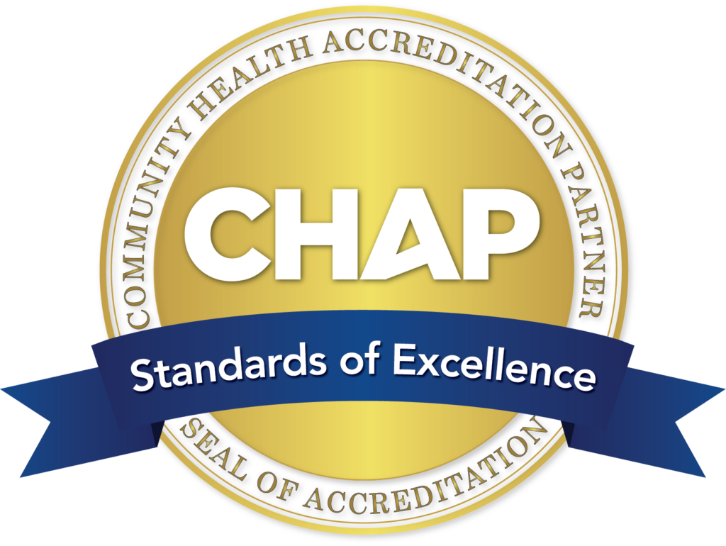 Accredited by the Community Health Accreditation Partner (CHAP), recognizing compliance with nationally recognized standards of quality, safety, and performance in home health care.
